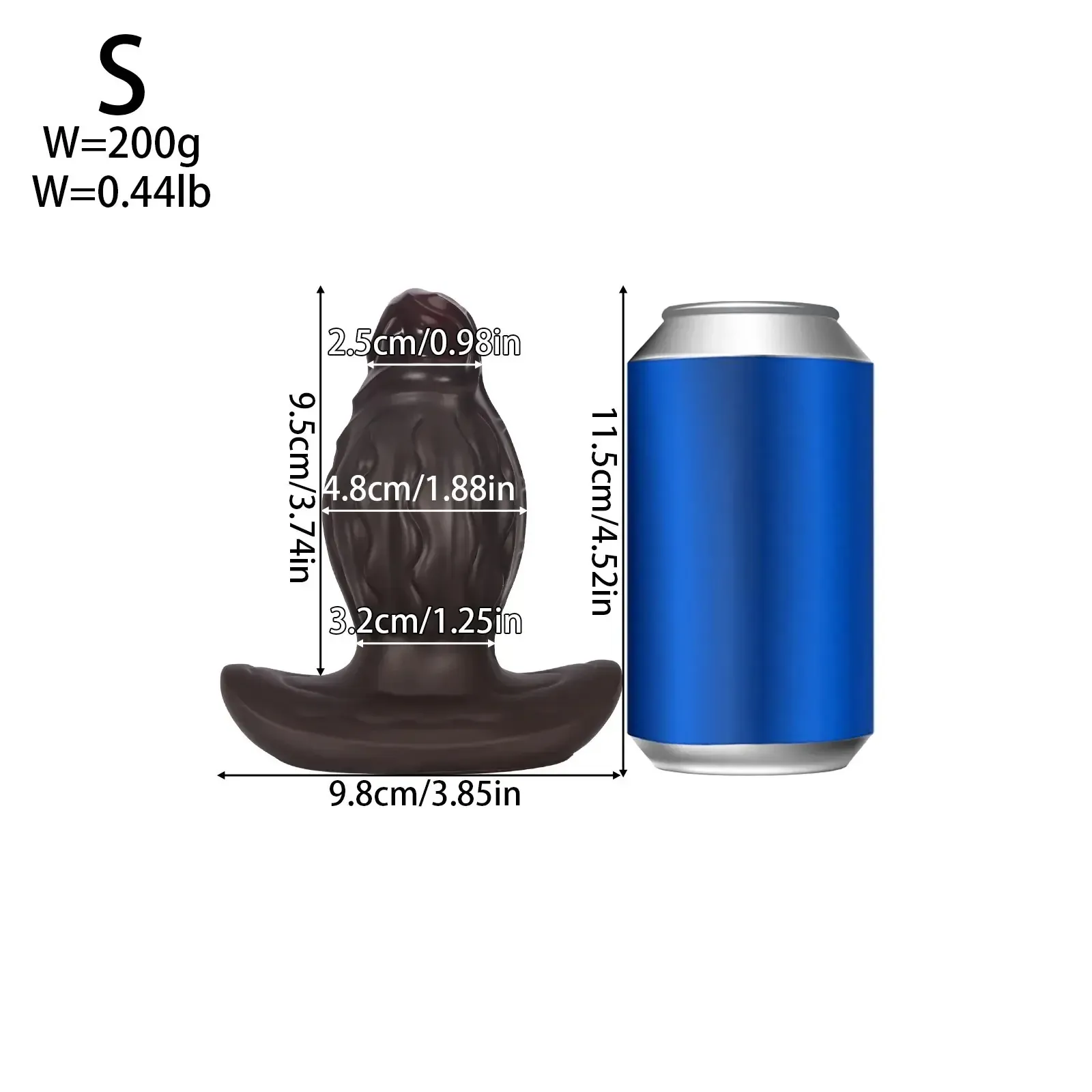 - Talla S: 9.5 cm de longitud, 2.5 cm de diámetro