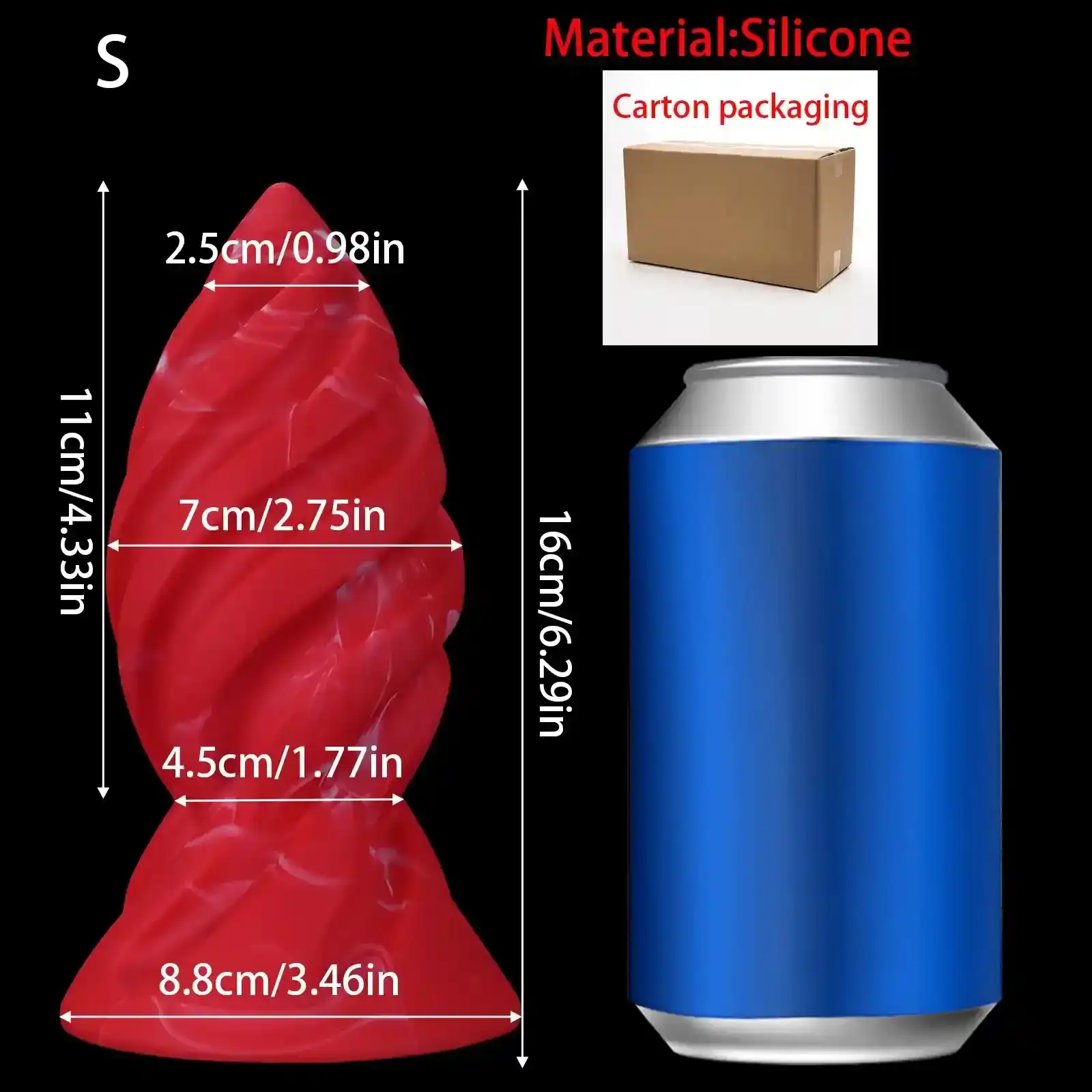 - Pequeño: 11 cm (Largo) x 7 cm (Diámetro máximo); 8.8 cm (Longitud insertable)