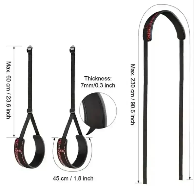 - Dimensiones: Correas de muslo ajustables hasta 60 cm, Correas de pierna ajustables hasta 230 cm, Grosor: 0.7 cm, Ancho del cinturón: 4.5 cm