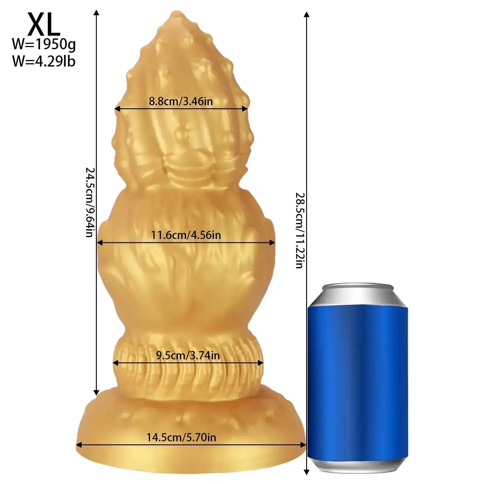 - Dimensiones: (Las siguientes son las medidas del tamaño más grande – XL. Adaptar al resto de tamaños según sea necesario. Diámetro: 8.8 cm, Longitud Insertable: 24.5 cm, Longitud Total: 28.5 cm)