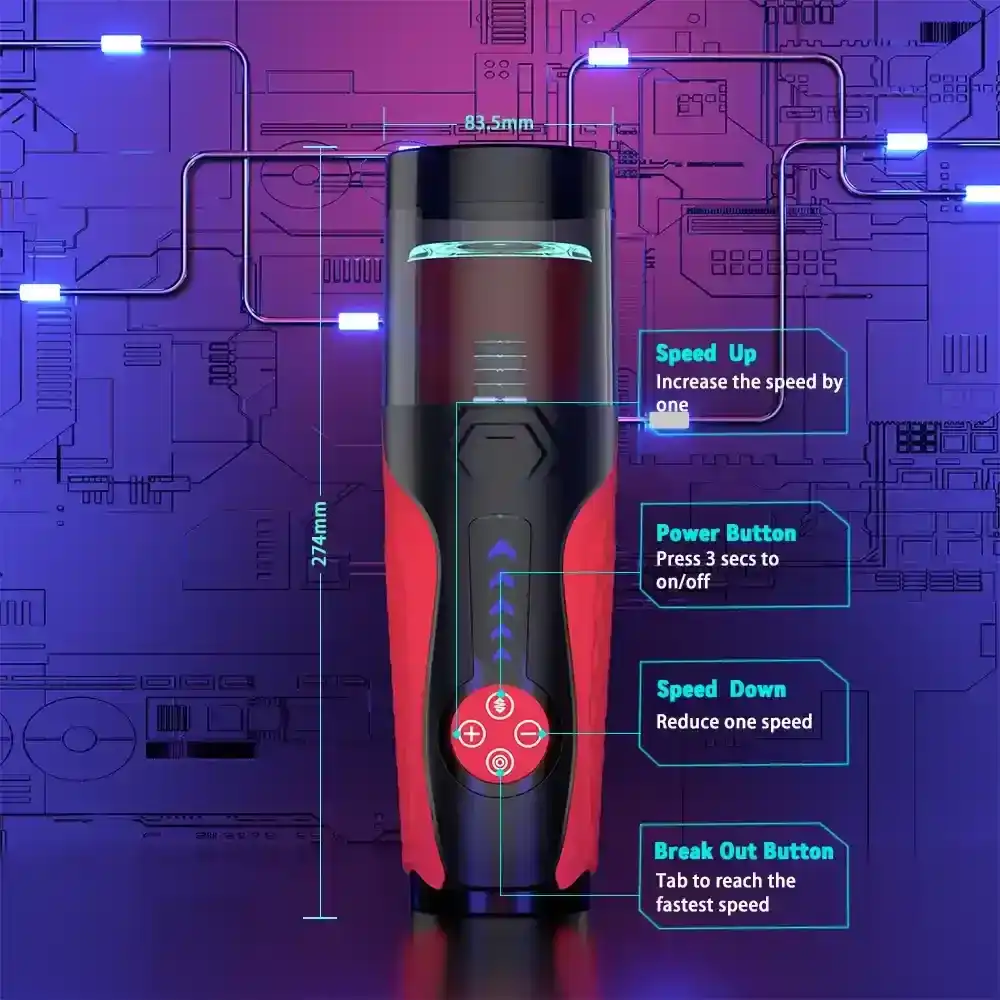- Intensidad Ajustable: Controla fácilmente la velocidad con los botones dedicados «Aumentar Velocidad» y «Disminuir Velocidad», y alcanza instantáneamente la máxima intensidad con el botón «Éxtasis».